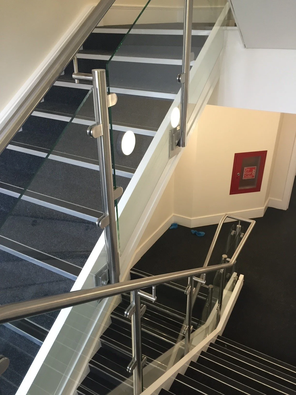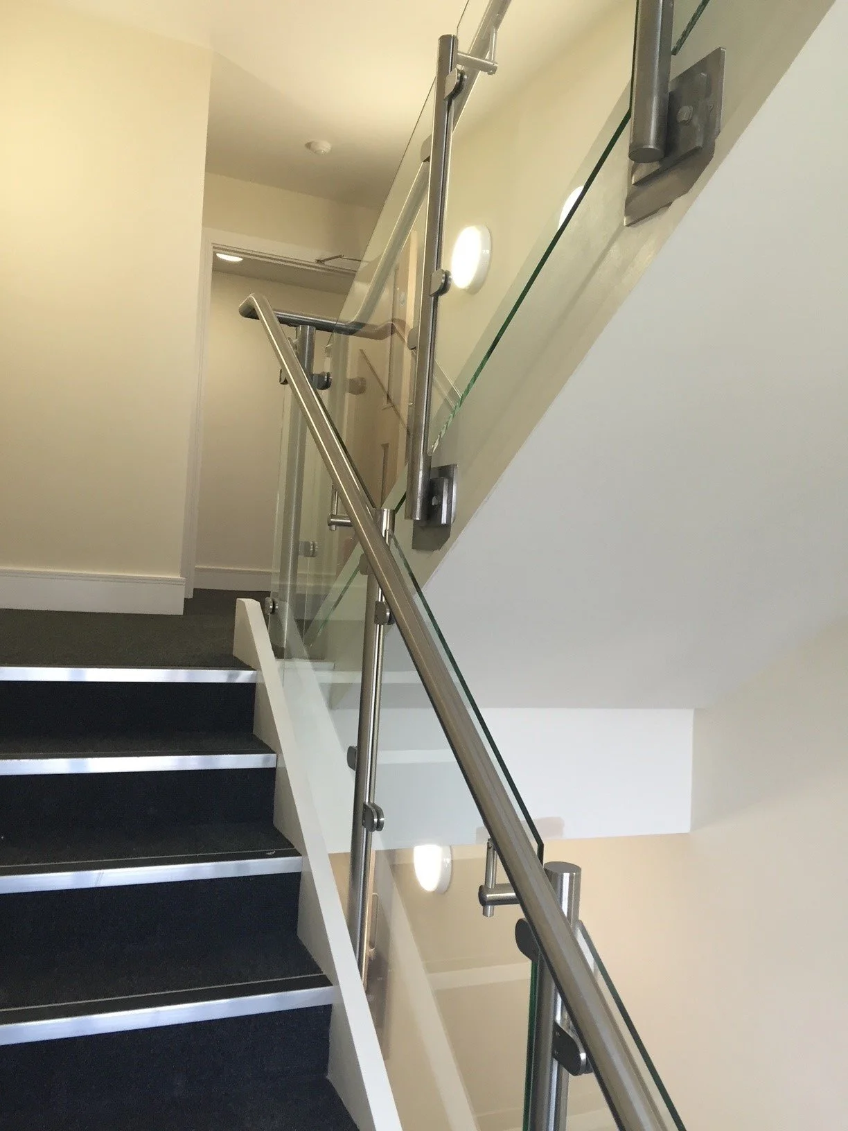 The reception railings required higher load-bearing capacity due to public access, which was achieved using a robust aluminum post and rail system. Toughened glass infill panels were used to provide a clean, modern aesthetic, which was seamlessly continued through to the communal staircases.