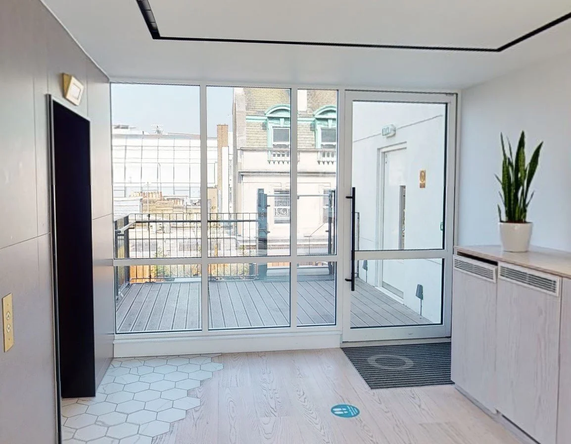 Additionally, a low-profile sliding automation system was installed to maintain minimal sightlines. Harlow Glass also completed the installation of a new entrance screen and access pivot door on the new fifth-floor terrace. The screen and door sightlines were designed to match those on the floor above while achieving a level threshold for easy access for all building users.